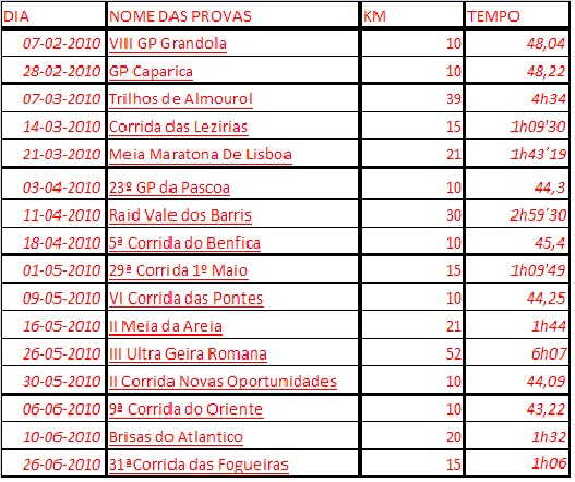 Após a conclusão do primeiro semestre do ano de 2010, tendo participado em 16 provas, 298km percorridos entre provas de estrada e trilhos. De todas as provas em que participei, a que me marcou mais sem dúvida foi a dos Trilhos de Almourol, pela estreia em provas fora de estrada e sua dificuldade. Enaltecendo a maior distancia percorrida 52km Geira Romana.Olhando para o segundo semestre na qual pretendo continuar a participar nas provas, mas ocorrendo menos vezes por motivos profissionais, vida nova, mas há uma em que vou marcar presença, dia 1 de Agosto 2010 a Ultra Maratona Atlântica Melides/Tróia.